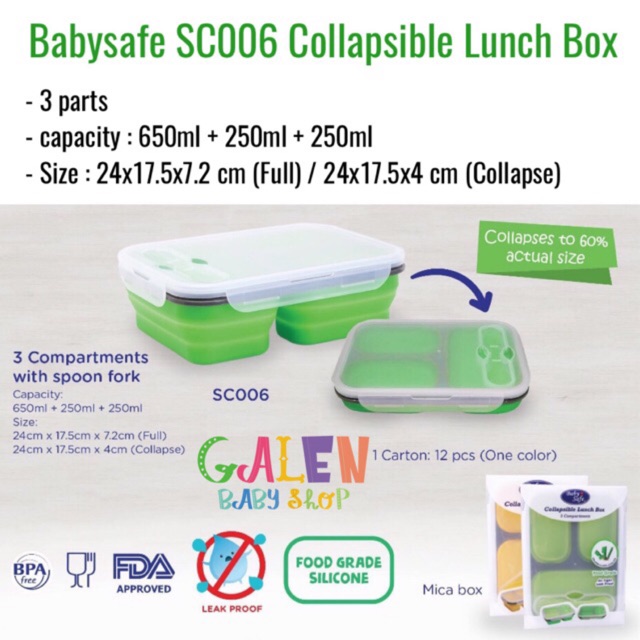 Babysafe SC006 Collapsible Lunch Box 3 parts3 compartments with spoon forkCollapse to 60% actual size Capacity :650ml + 250ml + 250mlSize:Full : 24 x 17.5 x 7.2 cmCollapse : 24 x 17.5 x 4 cmBPA FREEFOOD GRADE SILICONEReady : warna H