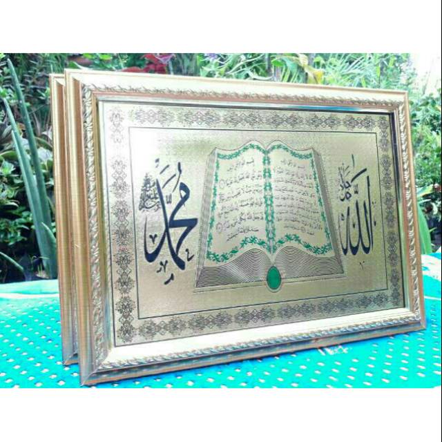 Deskripsi produk Hologram emas ( nyala , tahan panas , anti air dan tidak luntur ) Ukuran 30*40 cm Sudah di pasang bingkai fiber ukuran 3 cm warna emas Berat 500