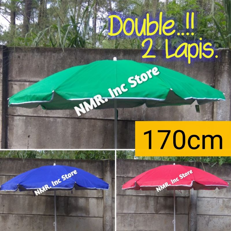 Payung tenda pantai polos Double (2 Lapis/ 2 Layer) dengan fitur (Coating Silver) Anti-UV di bagian dalam payung.Cocok untuk anda yg ingin berjualan di tempat terbuka, atau untuk peneduh di halaman rumah.Praktis, dan mudah dibawa-bawa. ----------------------------------------------------------------------------GRATIS!! packing Kardus + Bubble Wrap. --------------------------------------------------------------------------------Spesifikasi:- Diameter rangka 170cm, jika pas dibuka (melengkung) jadi 150cm. - Untuk lapak/stand ukuran Kecil.- Kain/ Parasol penutupnya terdiri dari 2 LAPIS (2helai), + coating silver anti-UV pada salah satu helai, jadi payung akan lebih teduh dan lebih aman dari bocor/ rembes.- 100% Anti air, dan anti panas matahari. - Ketinggian payung bisa disesuaikan antara 1.3 s/d 1.8 meter.- Sudah termasuk tiang tambahan/ extension.- Pemasangan payung dan tiangnya sistem sambung (2 bagian).- Kaki-kaki penyanga/ tripodnya (supaya payung ini bisa berdiri) dijual terpisah, silahkan cek di list iklan kami. Ada 3 pilihan warna :- Hijau daun- Biru- MerahTerimaka