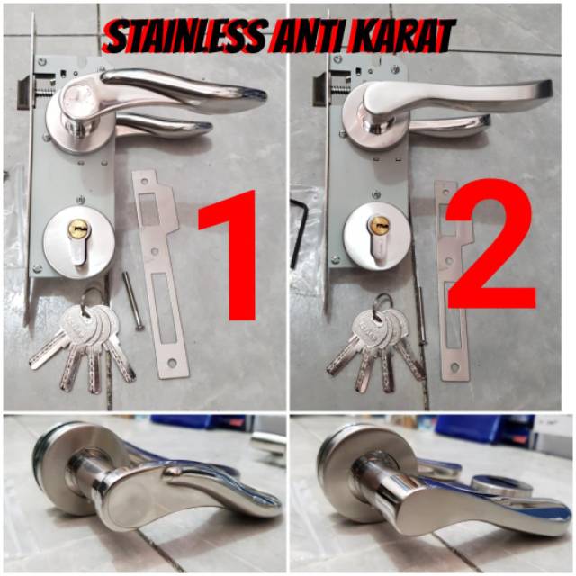paket kunci pintu roses stainless anti karat + body lidah comp key isi 4 anak kunci. kualitas bagus dan awet. panjang body lidah bagian dalam 17cm (standar)perlengkapan:- pegangan luar dalam- ring kunci luar dalam(2pcs)- sekrup, kunci L dll- body lidah, slinder (4 anak kunci), plat kusen, sekrup dan baut.tersedia 2 model, untuk pemesanan harap tulis 1 atau 2. jika tidak tulis dicatatan maka akan dikirimkan stok yg terban