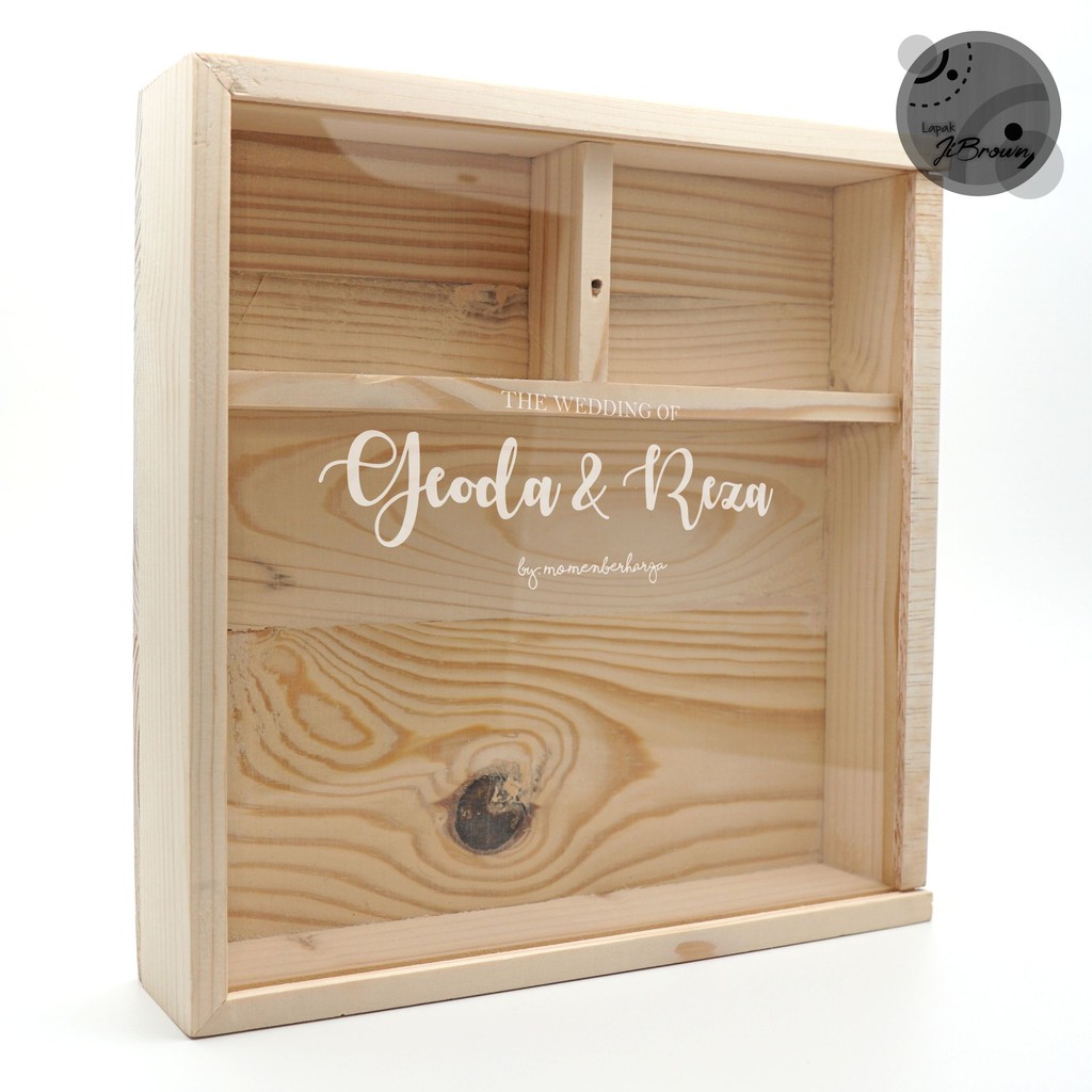 Produk ini adalah Box Cananga. Ukuran logo / ukiran / text maksimum 50 cm2. Wooden Gift Box berbahan kayu pinus ini memiliki dimensi 20 x 20 x 3 CM (ada sekat). Bisa digunakan untuk membungkus gelang, mahar, cincin, flahsdisk pernikahan, kado ataupun sebagai kotak serbaguna. Material produk ini adalah kayu pinus dan penutup akrilik, dengan finishing natural look.Kami memliki beberapa ukuran box, silahkan dipilih dan sesuaikan dengan kebutuhan anda. Tipe & Ukuran Box (cm) P x L x T ___________________Agathis 8 x 6 x 3 Buchanania 20 x 11 x 3 (ada sekat)Canannga 20 x 20 x 3 (ada sekat) Dillenia 25 x 25 x 5Eucalyptus 31 x 22 x 5 Fagraea 17 x 7 x 5 (dengan engsel) Gluta 20 x 20 x 5 (dengan engsel dan tutup acrylic bening)Hopea 8.5 x 9.5 x 5 (prisma heksagon dengan tutup acrylic bening) Intsia 15x15x15 Javanica 7 x 7 x 5 (dengan engsel)CATATAN: - Untuk penutup ada 2 pilihan bisa menggukan kayu/triplek atau akrilik dan bisa juga gravir/ ukir nama.- Preorder (PO) untuk Custom Ukir/gravir jika pesan yang polos langsung kami kiri