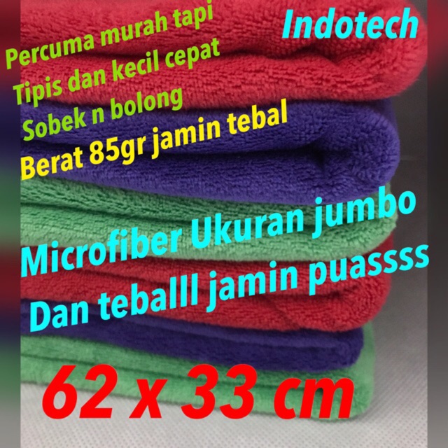 Micro Fiber Ukuran 62cm x 33cm Dengan Berat 85gram. DIPASTIKAN BEDA SAMA YG LAINNYA YG KECIL DAN TIDAK BERAT TODAK MEYERAP AIRMURAH TIDAK BERKUALITAS PERCUMA BELI 10CUKUP 1 TAPI BERKUALITASBahan: 80% Polyester 20% Polyamide (halus & lembut)Microfibre Technology ini memiliki beberapa kelebihan, yaitu:1. Daya serap air tinggi2. Daya serap debu tinggi3. Mudah dicuci4. Tidak mudah sobek5. Warna tidak mudah pudar6. Cocok untuk kaca mobil, body mobil, lap perabotan rumah tangga.6. Lembut, tidak kasar dan tidak memberikan efek baret / goresan pada permukaan yang di lap.WARNA RANDOM YA GUY