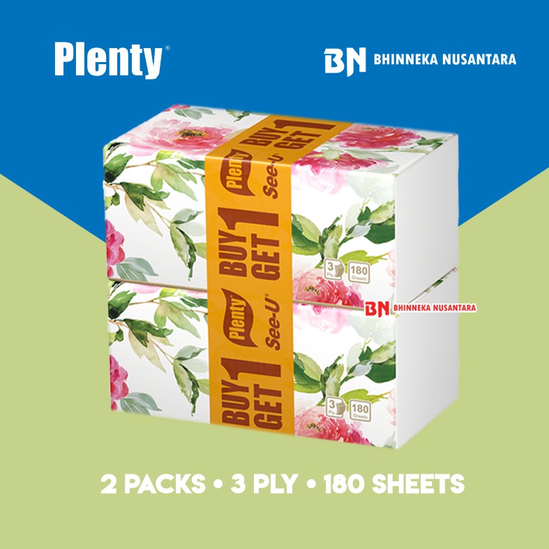 Plenty Facial Tissue Premium [3 Ply/180 Sheet] - Buy 1 Get 1 adalah tisu wajah yang terbuat dari 100% serat alami, lembut dan nyaman di kulit. Diproses secara higienis untuk menghasilkan tisu halus berkualitas tinggi bagi keluarga Anda. Sangat efektif untuk membersihkan kotoran yang menempel di kulit wajah dan mudah dibawa kemana
