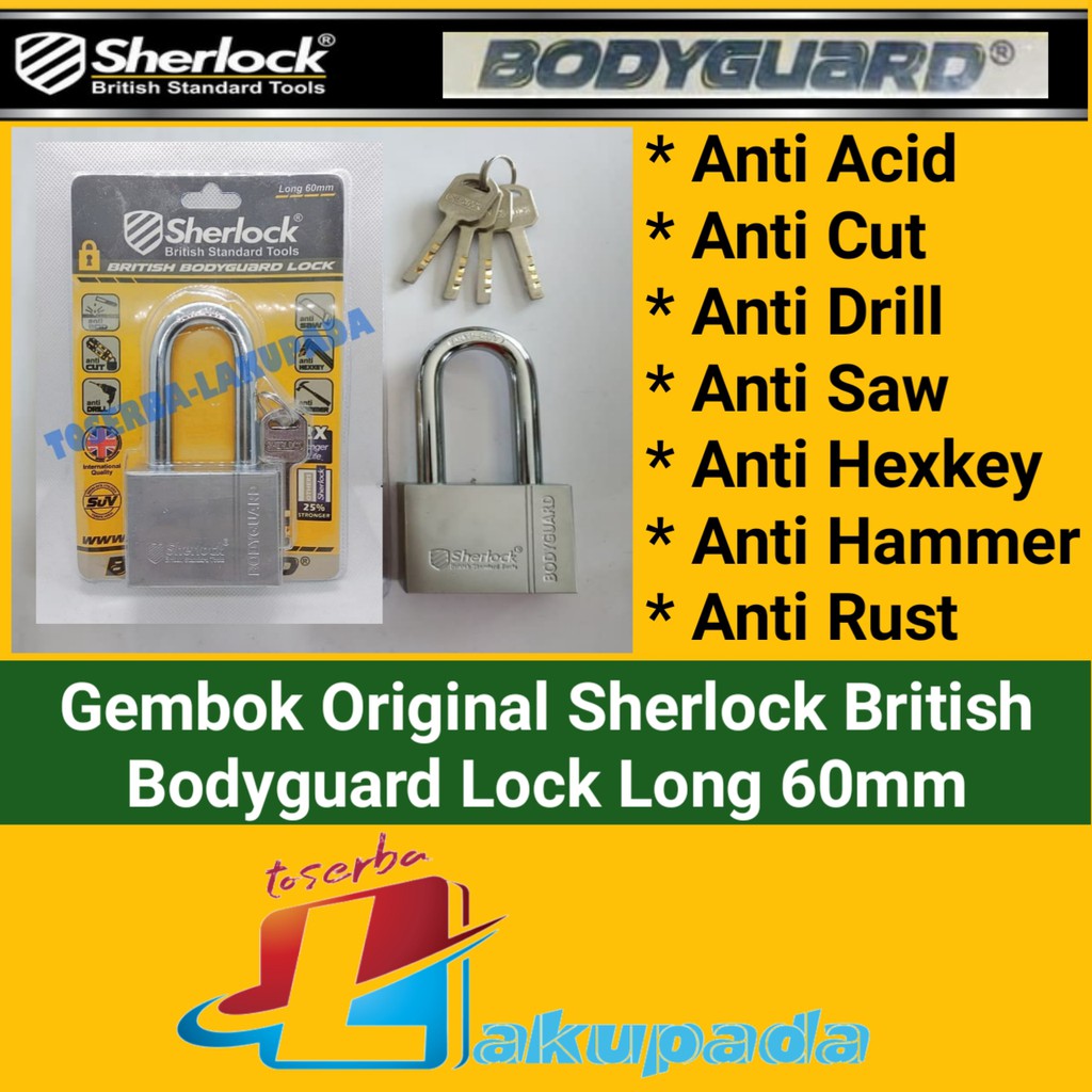 Gembok Original Sherlock British Bodyguard LockKami jamin barang asli 100% original dan berkualitas tinggi !Long - Leher Panjang 60mmMendapatkan 4 anak kunci.* Anti Acid* Anti Cut* Anti Drill* Anti Saw* Anti Hexkey* Anti Hammer* Anti